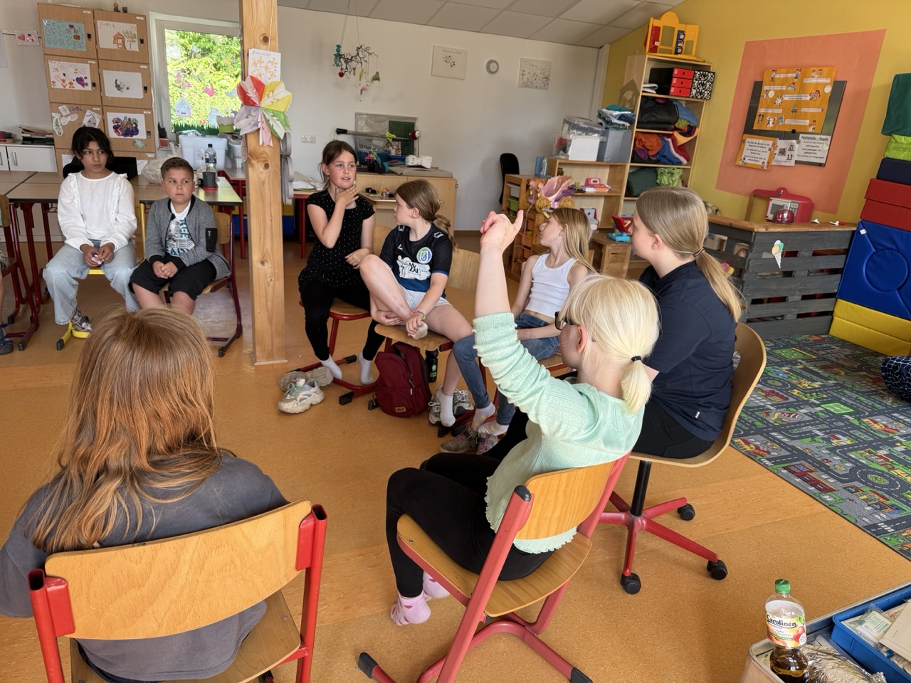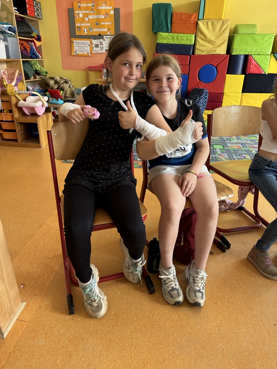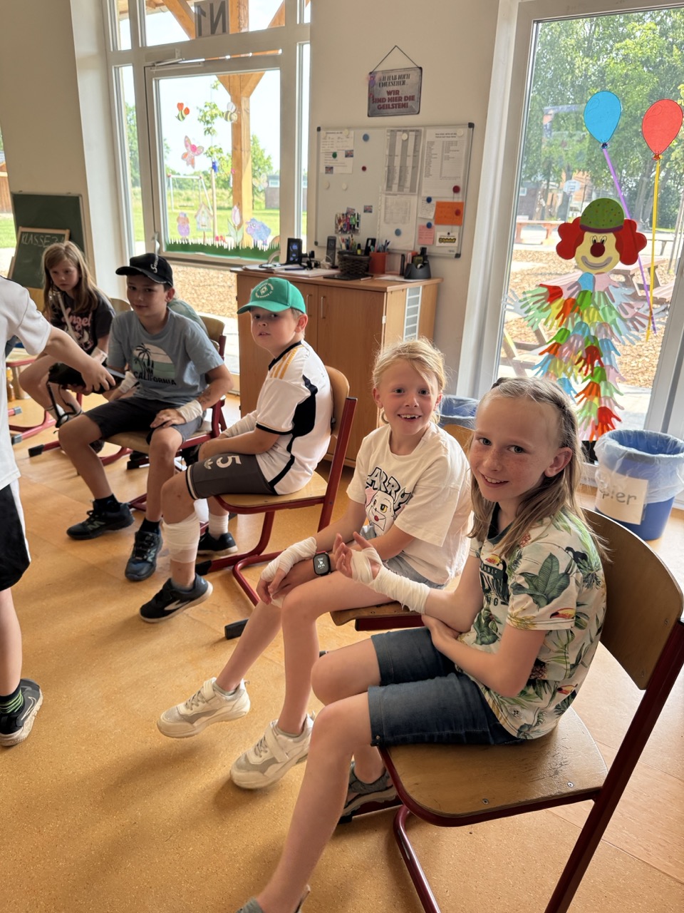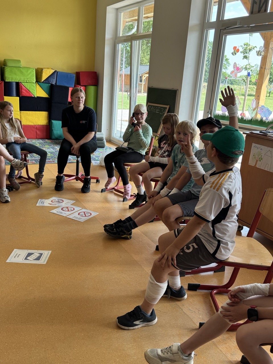 Am Standort Eldagsen haben Kinder aus der Klasse 3a die Ausbildung zum Schulsanitäter/ zur Schulsanitäterin absolviert. Die Kinder haben gelernt Verbände zu wickeln, sie haben darüber gesprochen, wie man sich bei starken Bauchschmerzen verhält, wissen jetzt wie man einen Notruf absetzt und haben die stabile Seitenlage geübt.