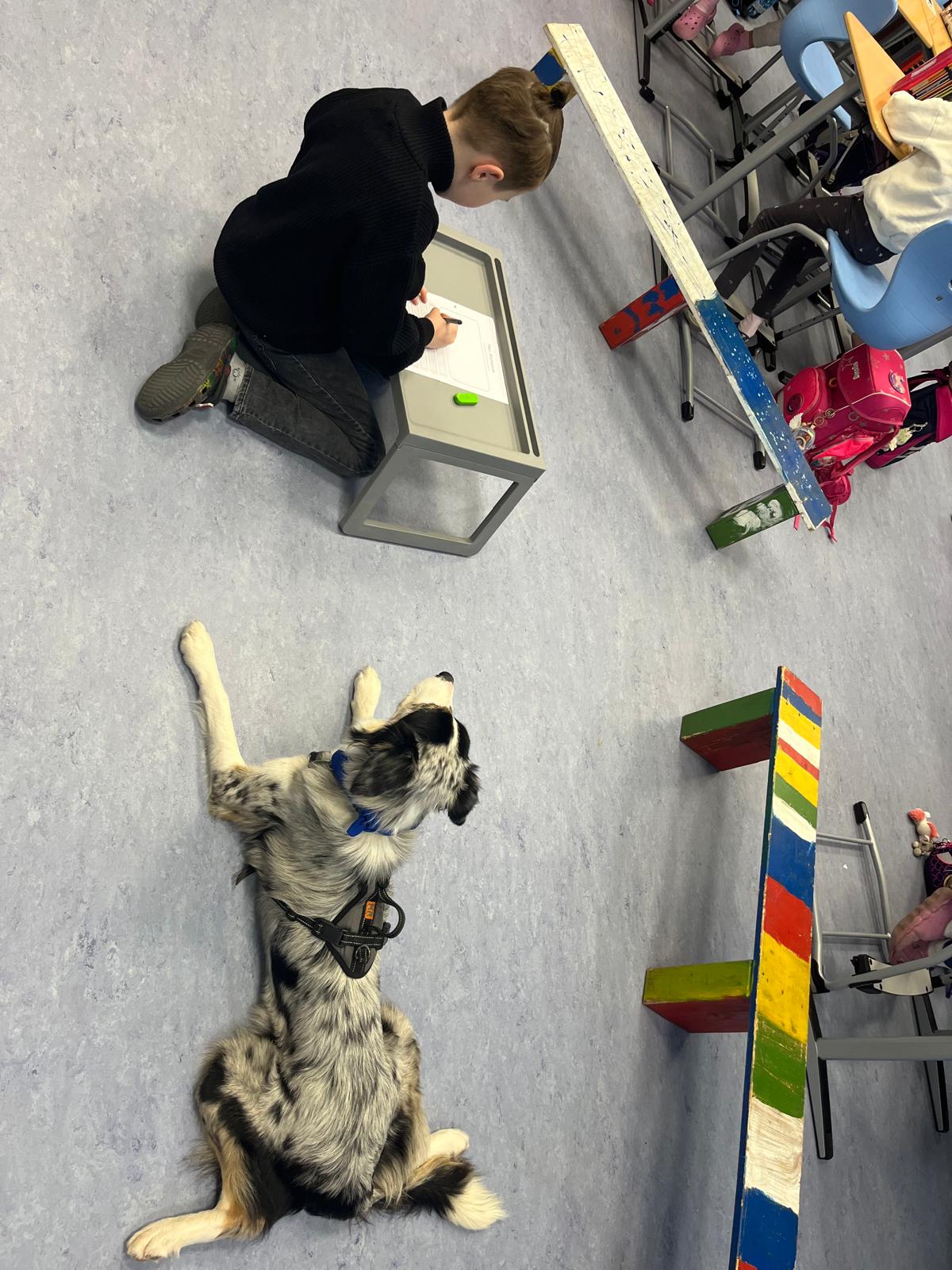 Seit nun einem Jahr begleitet Hündin Emma Frau Ledig einmal pro Woche in die Schule. Als ausgebildete Schulhündin unterstützt sie die Kinder auf vielfältige Weise beim Lernen. Die Schülerinnen und Schüler freuen sich jedes Mal sehr auf ihren Besuch.